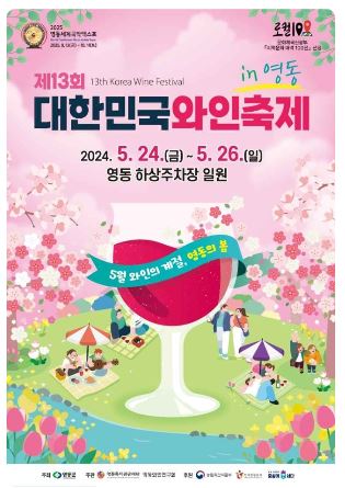 와인의 고장 충북 영동에서 열리는 대한민국와인축제 5월 24일부터 26일까지 영동 하상 주차장 일원에서 개최됩니다. 대한민국 최고의 와인을 소개하는 축제로, 영동지역의 40여 개 와이너리 농가에서 만든 와인은 물론 영동 외의 지역 와인도 함께 즐길 수 있습니다.