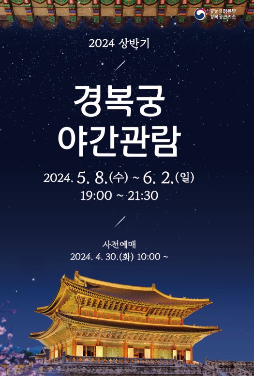 2024년 경복궁 야간관람 예매는 4월 30일 화요일 오전 10시부터 인터파크티켓에서 선착순 판매됩니다.